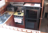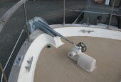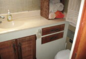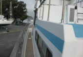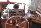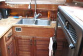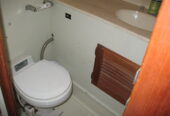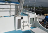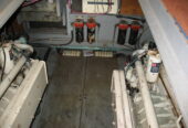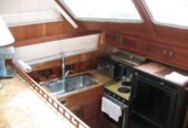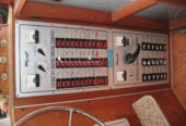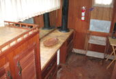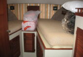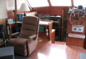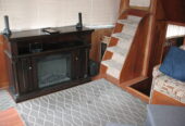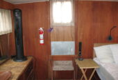- There are 4 entry doors that get you into the vessel including two sliding doors, port and starboard, door to bridge and door to aft cabin. Main salon is large with built-in sectional couch, recliner and electric fireplace. Full galley is down on portside with dinette directly across to starboard. Moving forward to port is enclosed head with Vacu- flush toilet system. Large guest cabin forward with lots of cabinets and drawers for storage as well as large hanging locker. Moving aft of the salon and stepping down is the captain's stateroom with private head and separate enclosed shower. Double bet with built-in vanity, full length mirror and hanging locker. Nice headliner throughout the vessel. Large windows with blinds