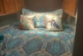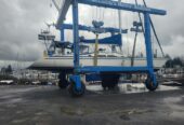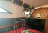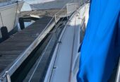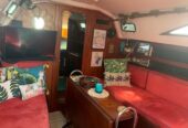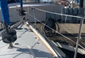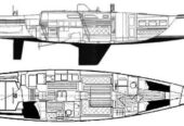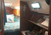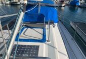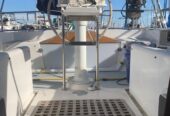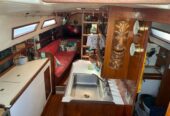 Entering the main companionway, straight ahead is the galley sink and storage. To starboard is the entrance to the aft cabin and its accompanying head forward. On port aft is a full navigation station and storage under the companionway steps. Going forward is a long galley which leads into the salon. On each side is a long setee with a folding table in the center. Aft in the center of the salon is a second companionway with it’s own dodger and screen.