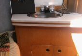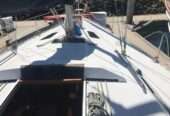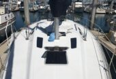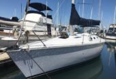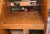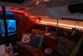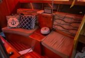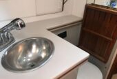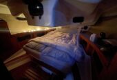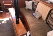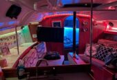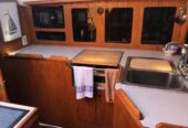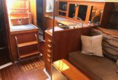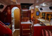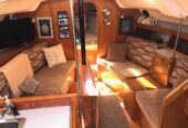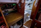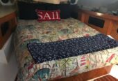 Forward is a cozy V-Berth with a sink and ample storage. Aft is the salon with a centerline drop leaf table and double settees. Aft to port is a spacious galley. Across to starboard is the nav station and head. with access from both the galle and head, the master stateroom offers a centerline queen berth and ample storage.