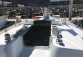 Aft and up the companionway is a large cockpit with an integrated folding table and walk through transom.