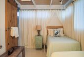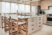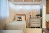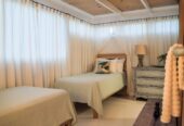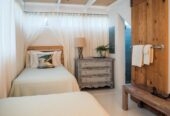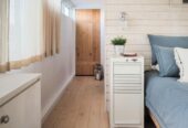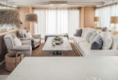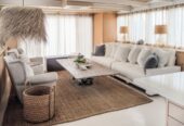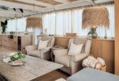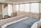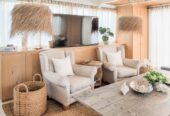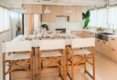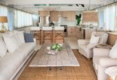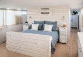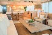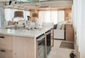 She boasts Alder flooring with Danish wood finish, yacht finish upholstered paneling throughout, a sophisticated beach oriented décor, linen and white semi opaque curtains throughout, custom cabinetry with adjustable shelves and Blum Blu Motion drawer guides for ample storage!